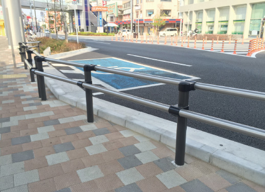 金具は、ボルトの突起を少なくした歩行者にやさしい設計です。オプションで手摺を添架できますので階段やスロープのバリアフリー整備にも活用いただけます。