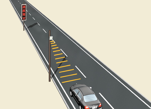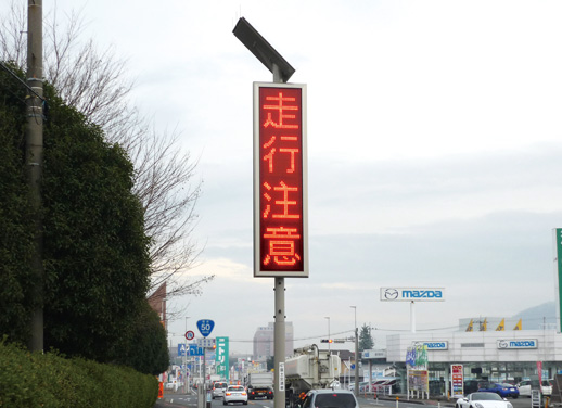 昼夜を問わず注意喚起を促す24時間発光LED電光表示板。