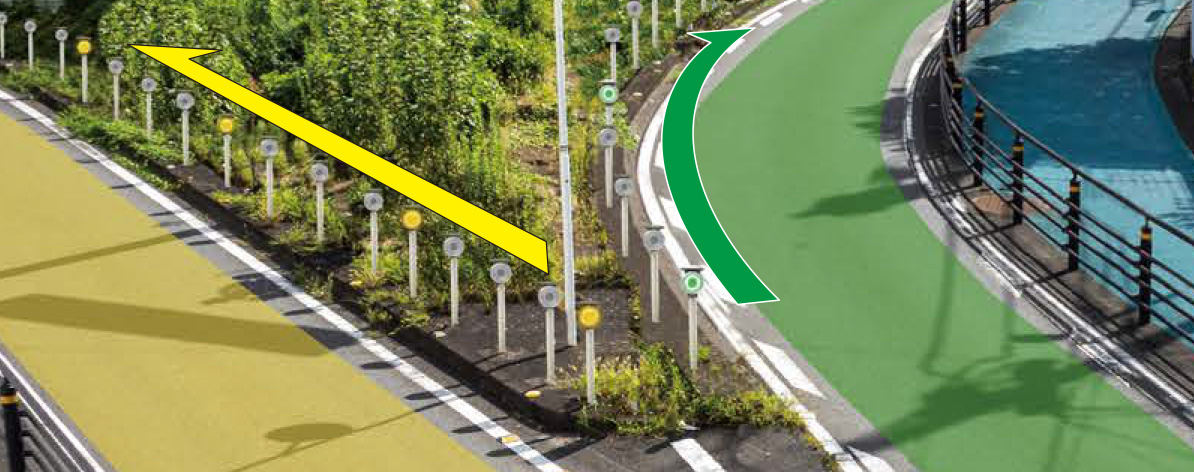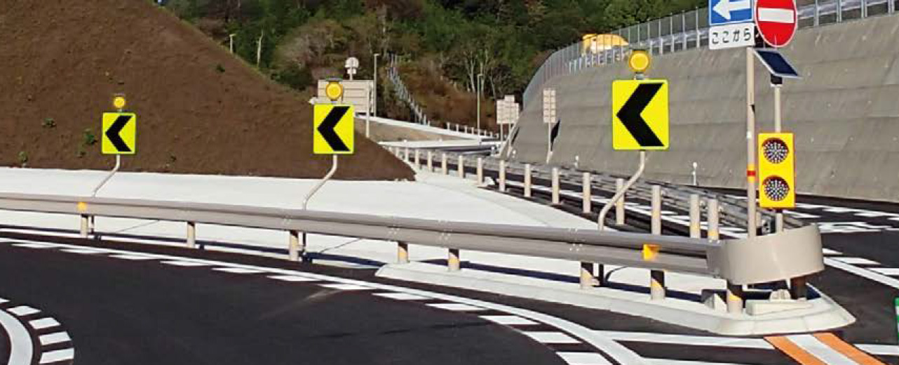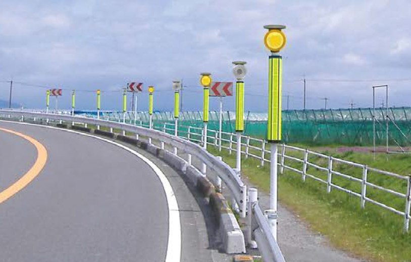 カーブ部や合流部など通行に注意が必要な場所を、流れる連動発光で目立たせ、道路線形をわかりやすく案内します。