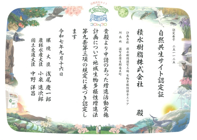 「30by30」達成のための国内の取り組みとして、2025年4月より施行された地域生物多様性増進法に基づく「自然共生サイト」において滋賀工場と物流センターの2拠点が認定されました。両保全エリアには土地開発などで激減する「貧栄養湿地」が残存しており、湿地性の動植物をはじめ多くの希少な生きものが生息しています。この希少な環境と継続的な保全、観察会など環境教育の場としての利用などが評価され、認定に至りました。