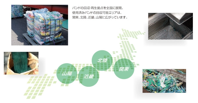 積水樹脂グループでは、廃棄物として処理されていた使用済みバンドを回収、再生してリサイクルバンドにするリサイクルシステム(Band to Band)に取り組んでいます。