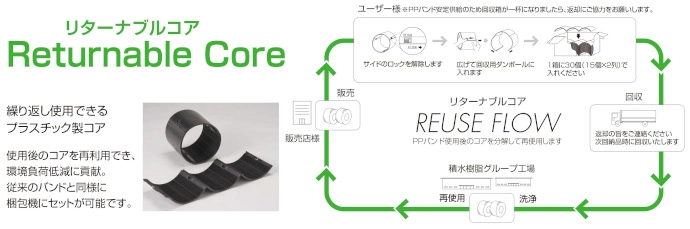 アスクル(株)にて回収された使用済みクリアホルダ―由来の再生材を25%配合したPPバンドを製品化しました。本製品は、「SEKISUIJUSHIマタクルリサイクル PPバンド」(認定番号 24112012)としてエコマークを取得しています。強度性能は、バージン材料を使用した製品と同等であり、国内主要メーカーの梱包機に対応しています。